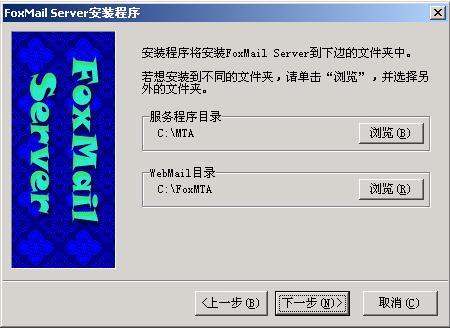 c.程序确认上一步各号码准确无误后继续安装,用户可以指定服务程序目录和WebMail的安装目的位置。其中服务程序目录用于存放邮件服务程序文件,WebMail目录用于存放邮件系统用户数据、地址簿数据等文件。用户可以将这两个目录安装到服务器上任何一个硬盘中,而不一定要求在C盘。