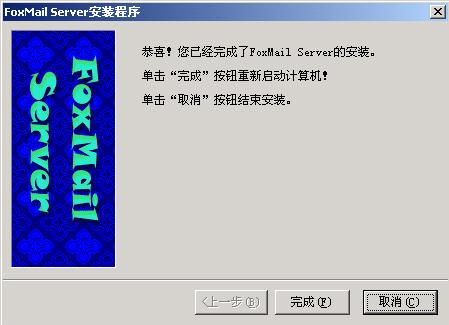 f.完成上述工作后,FoxMail Server for NT/2000已经基本安装和设置完成,并出现以下页面,用户可以选择点击“完成”重新启动服务器,也可以选择点击“取消”结束安装。注意选择“取消”同样也完成了FoxMail Server for NT/2000的安装,只是不重新启动服务器而已。我们建议用户尽可能的重新启动机器。