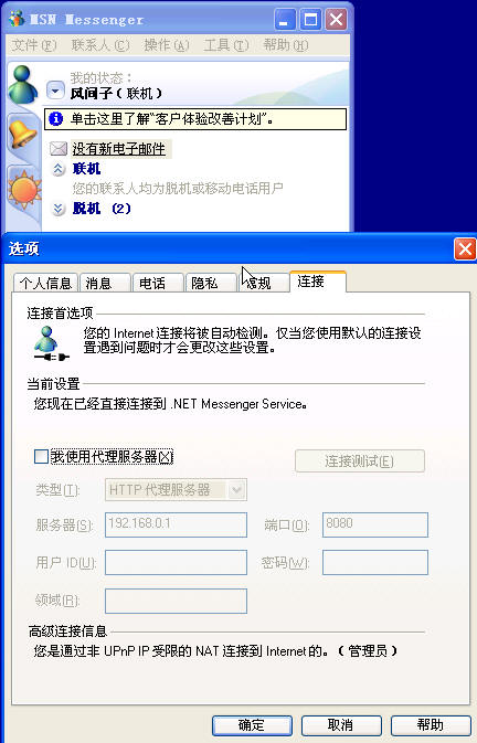 msn也很聪明,自动使用我的HTTP代理来登录: