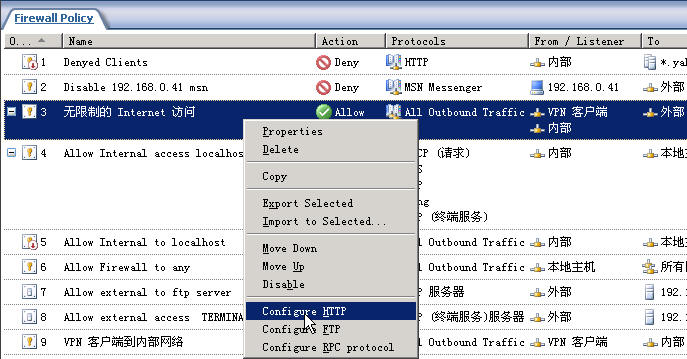 然后在“All Open”策略前加了一条禁止该客户使用msn的策略,规则中协议使用的是ISA Server