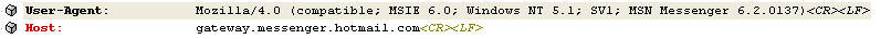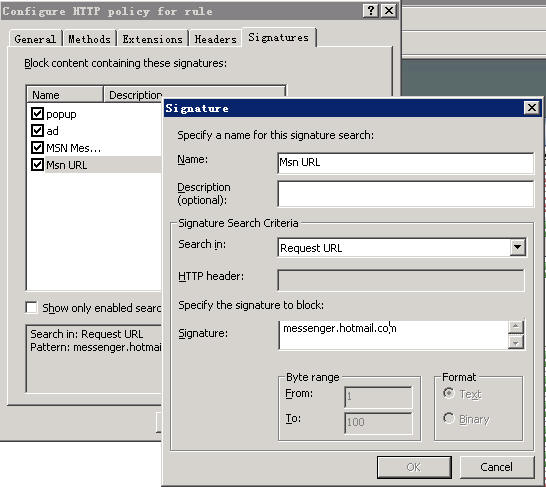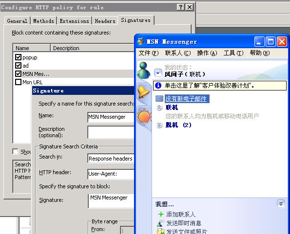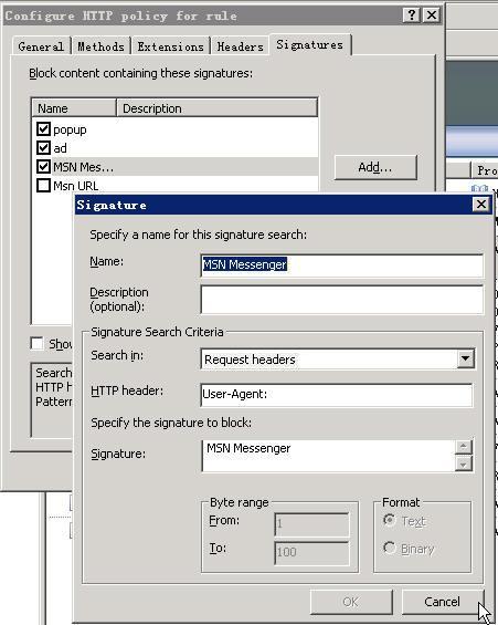 如图,确实在User-Agent里面有MSN Messenger,但是不知道为什么,ISA Server 2004不能禁止MSN。