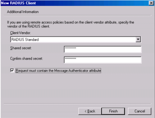 在附加信息页,确认客户-销售商选项设置为标准RADIUS。在共享密钥文本框内输入一个密码,然后在确认共享密钥文本框内再次输入进行确认。然后勾选请求必须包含消息验证者属性,点击完成;