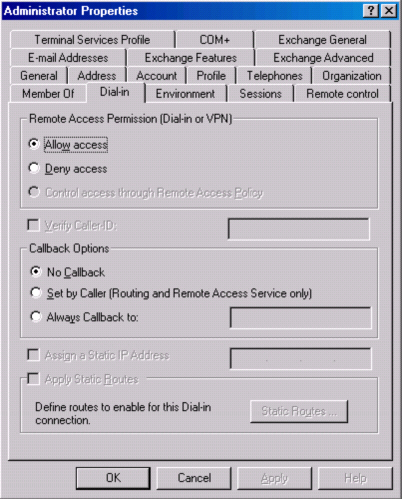 下一步是启用用户账户的拨入权限。如果你的活动目录域是本地模式或者是Windows Server