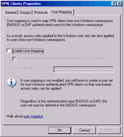 Server没有加入域,那么不要使用用户映射。ISA Server必须有访问活动目录数据库的权限,才能将没有提供域信息的VPN客户(如RADIUS客户)映射到ISA