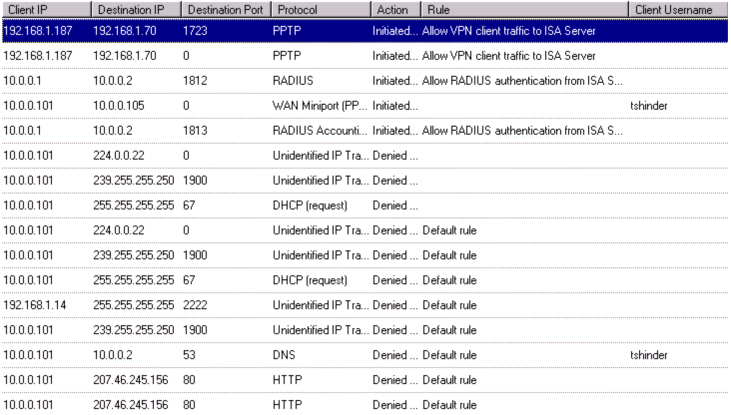 在远程VPN客户上建立VPN连接,你可以发现,你只能访问OWA站点,并且只能使用HTTPS进行访问。下图是ISA中的日志信息,VPN客户得到的IP地址是10.0.0.101。很奇怪的,你可以在ISA的记录中找到用户身份信息,但是就算你在访问规则中设置了对应的用户组,这个设置也是不起作用的。