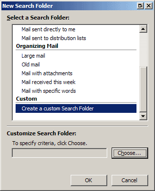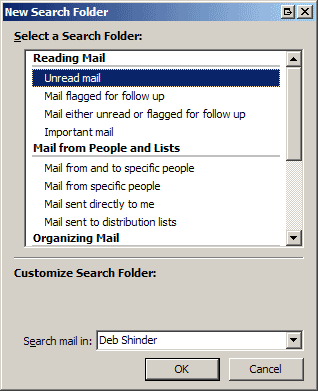2.在New Search Folder对话框中,你可以从列表中选择预先定义好的搜索文件夹,或者建立一个自定义搜索文件夹。可以通过滚动条并单击来选择预定义文件夹。在本例中,我选择Unread Mail。