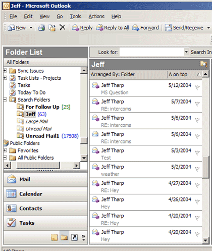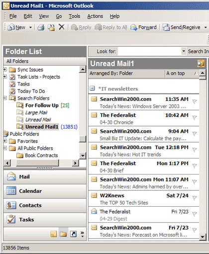 4.然后单击OK。新的搜索文件夹将显示在Outlook文件夹列表中。所有符合查找标准的文件(标记为未阅读的邮件)都会显示在中间的信息区域里,如图C所示。你可以看到我有很多未阅读邮件。