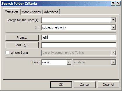 现在可以通过单击Search Folder Criteria 对话框中的More Choices选项卡来进一步缩小搜索范围。现在,你可以采用以下方式: