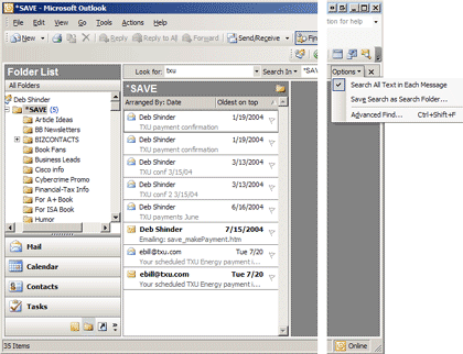 可以从Find工具条创建搜索文件夹,首先发起查找:单击工具条上的Find,在Look For and Search In填入条件,然后单击Find Now。在查找完成后,你可以单击Options并在菜单中选择Save Search As Search Folder,如图H所示。