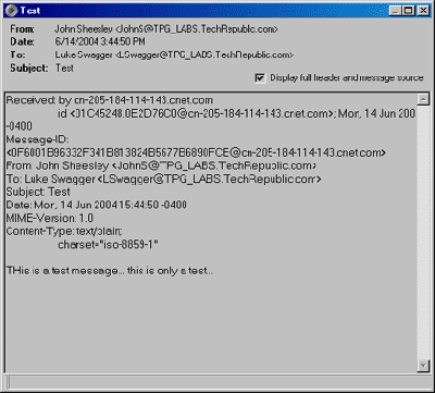 你可以在双击消息以启动电子邮件客户程序之前对这一消息进行预览。这将允许你从内容上检查电子邮件并在把它转交给日常使用的邮件客户程序之前对发送方进行证实。如果选择了Display Full Header And Message Source(显示完成信头以及消息来源),你将会看到同图C所示一样的所有邮件信息。