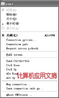 远程控制时,在主控端上安装Winvnc,运行Winvnc组件中的“VNC查看器”,会弹出一个“连接明细”的窗口(如图9),在“VNC服务器”处填入被控端的网关IP:外部端口号(比如218.193.12.115:5900,如果外部端口号与内部端口号一致,也是Winvnc的控制端口,可以不用填外部端口号),然后点“确定”开始连接,连接成功后会要求输入被控端的密码,接下来就可以进行远程控制了。进行远程控制时,被控端的状态栏中VNC小图标会变成黑色,控制时,点击窗口作左上角会打开一个菜单(如图10),选“Send Ctrl-Alt-Del”可以打开被控端的任务管理器,选“connection options”可以打开一个菜单,调整连接选项,勾选“使用8位元颜色”可以提高控制的速度,远程控制完毕,关闭窗口即可断开连接。