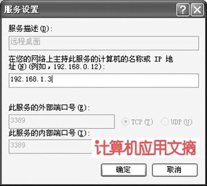 注意其中有一项“远程桌面”,勾选这项,会弹出一个“服务设置”的窗口,其中的端口号等设置已经设好了,我们只要添加上被控端的内网IP(比如192.168.1.3)就可以了(如图2),点两次确定后就设置好了远程桌面的端口映射。