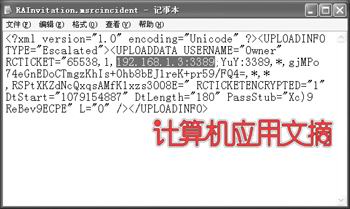 首先,按上文的方法在被控端上设置好端口映射,然后点击“开始→所有程序→远程协助”来打开远程协助(如图4),依次点击“邀请某人帮助您→将邀请保存为文件(高级)”,输入姓名并调整过期时间,再设置好密码,最后保存邀请。系统会保存下一个不到1KB的文件,里面记录了连接信息,不过内网用户把它直接发给主控端是不行的,我们要用记事本把它打开,可以看到里面有段记载了内网IP(比如192.168.1.3:3389)(如图5),将其改为“网关IP:外部端口号”(比如218.193.12.115:3398,3389为Windows XP远程控制默认的端口号),并保存。