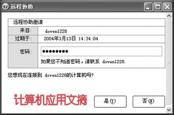 我们要在过期时间内把这个文件用邮件等方式发给主控端,并把密码告诉给他,主控端打开文件时会自动启动远程协助,输入密码后连接被控端(如图6),连接成功后,被控端会出现一个请求远程协助的窗口,点击“是”同意进行远程协助,此时只能看被控端的屏幕,要想进行控制,就点击“获取控制权”,这时被控端会出现一个窗口请求共享控制,点击“是”同意后才能进行控制,还可以进行传送文件等,远程控制完毕,要断开连接。Windows XP专业版也可以用这种方法进行远程控制。