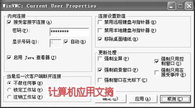 Winvnc现在有汉化版了,下载安装完后,开机会自动启动Winvnc,在右下角的任务栏会出现白色的VNC的小图标,在小图标上面点右键,选择“特性(P)”会出现设置窗口(如图8),在“密码”中填入验证密码。如果勾选那项“启用Java查看器(J)”,那么主控端就无须安装Winvnc,可直接用支持Java的浏览器进行控制,最好把“移除桌面墙纸”那项勾选,这样可以提高远程控制的速度,其他设置用默认就可以了,设置好后按确定即可。
