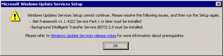 由于安装 WUS 时需要对操作系统进行更新,所以安装 WUS 需要的磁盘空间是不确定的。如果你没有对你服务器进行更新那么你就可能会看到如下图所示的安装错误提示。