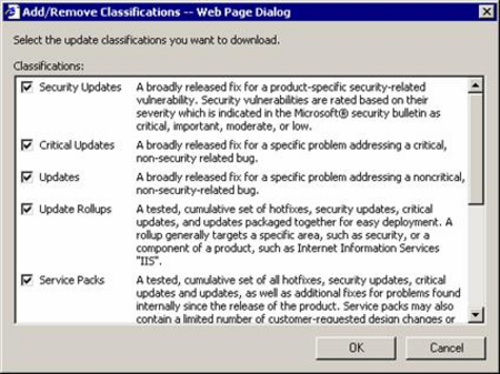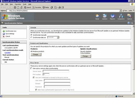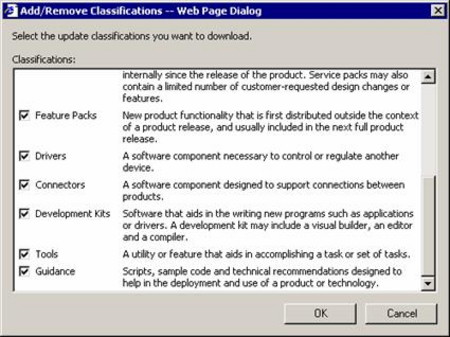 “同步(Synchronization)”页面和SUS的相应页面很相似,但是WUS多了“更新分类(Update Classifications)”这个功能,该功能可以让你查阅到你需要的更新类型,当然你还可以选择你所要更新的产品。