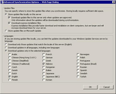 在“高级同步(Advanced Synchronization)”对话框中允许你选择使用的语言和更新文件下载、保存的方式。我的选择是每当遇到一个更新文件就把它下载下来保存在硬盘上。我下载完整升级包的原因是因为对于客户端来说快速安装是最重要的,特别是当客户机需要安装一个服务包(Service pack)的时候。