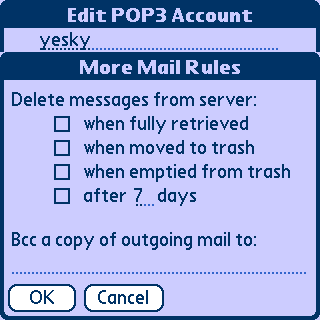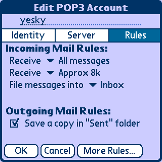 在Incoming Mail Rules下的第一个“Receive”(接收)里选择你想接收多少个最新的电子邮件。如果设置为All messages,则将服务器上的电子邮件全部下载。如果用GPRS接收的话,还是慎重一点比较好,毕竟1k三分也不便宜。当然如果你是200元包月的商务套餐,公司可以报销的话,那就无所谓啦。在第二个“Receive”里设置的是,你想接收多大的电子邮件,“Headers only”表示只接收电子邮件标题,如果你是自己掏腰包心疼的话,就选择这个,先下载标题,之后再挑你想看的邮件下载。这样能避免被一些广告邮件骗取昂贵的GPRS费用。否则当你经过漫长的等待后,却发现那是无用的垃圾信息占用了昂贵的流量时,你会觉得世界上最痛苦的事莫过于此。当然你也可以选择接收电子的大小,从2k到80k不等,这样可以预览一下,也不会造成太大的损失。在最下方的选项里有一个“Entire Message”,如果选这个的话,则会下载所有的信息,包括附件,如果有人恶意给你发个小软件的话,你就等着收移动的欠费单吧。