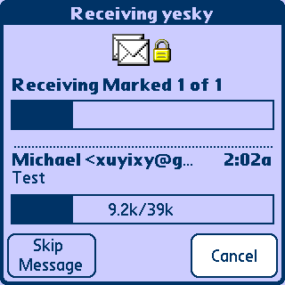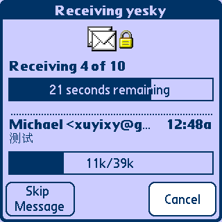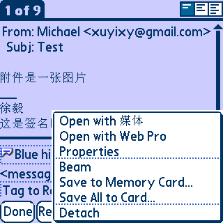 回到主界面,再接收一次邮件,附件较大的时候,会有稍许停顿,这是因为手机上GPRS的速率较慢造成的,并非死机,请大家不要砸机,呵呵。用usb或者蓝牙共享PC上网的话,就快多了。