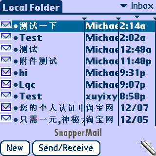 首先,确认你的掌上电脑装了Snapper Mail,本文中用的是Snapper Mail 2.04企业版。Snapper Mail可以说是功能最强大的电子邮件收发软件。速度较快,最新版本也支持附件的收发,这也是手机电子邮件无法达到的。此功能在本文后面有详细描述。遗憾的是,它不支持与OUTLOOK、FOXMAIL等邮件工具同步。不过这也没有太大的妨碍,如果你想将邮件保留到手掌电脑上慢慢看的话,我们可以通过让Palm通过USB连接PC上网收发电脑邮件,速度很快,一样很方便。什么?你不会?我@#¥%……其实我很想告诉你的,但我怕编辑说我骗稿费……