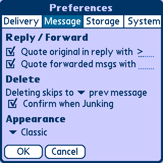 Message选项卡里的Quote original in reply with_____ 表示在引用对方内容之前显示的符号。Quote forwarded msgs with____ 表示转发内容之前显示的符号。Delete 里的Delteting skips to后的prev message表示删除后跳往前一封信,next message表示后一封信,message list表示回到邮件列表。Confirm when Junking选择后表示junking时就直接删除邮件。Appearance表示选择外观。