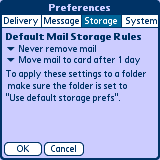 对于我等喜欢装软件的“胖子们”来说,RAM可是寸土寸金啊。因此最受欢迎的功能莫过于将邮件存到SD卡上。在Storage选项下的Default Mail Storage Rules后可以选择“Never remove mail”(永远不删除邮件)和过多少时间删除(1天、3天、5天、1星期、2星期)。再接下去的就是,“Keep mail in RAM”(保存在RAM里),强烈建议大家选择“Move mail to card afeter 1 day”(一天将邮件转移到扩展卡中)。当然你也可以3天、5天、1个星期、2个星期。下面的select memory card、migrate memory card分别表示选择一个扩展卡和定位一个扩展卡上的位置,当你换过扩展卡后你可以这么做。