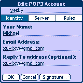 接着出现一个Edit POP3 Account的编辑对话框,在最上方的输入框里填入你给本帐户起的名称,这里填“yesky”。在Identity选项卡里填入你的用户信息。Your Name里填名称,注意:这个是在你发送电子邮件里的“发件人”的名称,并非邮件服务器的登陆名,可以任意设置,也可以是中文。E-mail Address里填电子邮件地址,Reply To address(optional):填回复电子邮件地址,比如你想让别人回信的时候回另外一个邮件,请在这里填上,这是可选项,可不填。