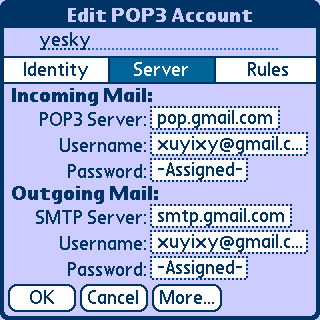 接着进入最重要的设置,这是邮件收发成败与否的关键。点选Server选项卡。在POP3 Server和SMTP Server里填入你的邮件POP3、Smtp服务器地址。不同的电子邮件提供商有不同的地址,具体可查询相应提供商的主页。这里提供几个比较常用的POP3、SMTP服务器地址: