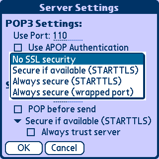 而在SMTP Settings里点击No SSl security前的下三角,我们选择Secure if available(STARTTLS)。这里仅针对Gmail而言,其他的电子邮件请根据不同情况多试几次。如果选择了POP before send,则在每次发送邮件以前都会先查收一次邮件。在本例中,Always trust server都留空。