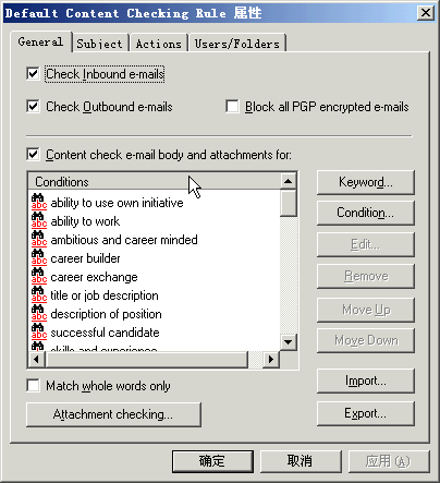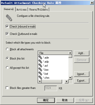 | MailSecurity GFI MailSecurity for Exchange 2000-2003/SMTP专注于邮件病毒防护,具有病毒扫描、附件阻止,内容过滤、压缩文件扫描等功能。它采用多个病毒扫描引擎同时扫描邮件,并具备强大的管理功能。Web图1*为软件安装后的菜单。 其中GFI Monitor监控邮件传输活动。Moderator Client可以对被阻止并归档的可疑邮件进行处理,比如删除,审批发送等等。界面如图8所示。 图8 Moderator Client界面 软件的核心部分在配置部分,如图9所示。 图9 GFI MailSecurity配置界面 其中Content checking配置对邮件内容和主题的检查规则以及处理方式。如图10,可以创建多个规则,并且可以指定每个规则将应用到哪些用户邮箱。 图10 内容检查规则 Attachement Checking配置邮件附件过滤规则,图11,可以检查邮件附件类型,阻止可能带来危害的邮件附件,比如*.scr、*.pif、*.exe等等。同样可以建立多个规则,针对每个规则指定不同的处理方式,以及将规则应用到不同的用户邮箱。 图11 附件检查规则配置界面 Virus Scaning Engine节点用来配置多个病毒扫面引擎的作用优先级、扫描方式以及在线更新方式,见图12。 图12 病毒扫描引擎属性 E-mail Exploit Engine、Trojan&Executable Scanner和HTML Threat Engine则是针对HTML格式邮件的一系列规则,用以阻止邮件中的恶意代码、可执行脚本等等。可对每一个规则进行具体行为配置,见Web图2。 Decompression Engine是对邮件中的压缩文件的处理规则(Web图3),以及对符合条件的邮件的处理方式(图13)。 图13 对符合条件邮件的处理方式 Quarantine Options则是配置报警方式(图14)。 图14 Quarantine Options属性 当发现邮件病毒并阻止邮件后,软件会向指定管理员以及用户发送报警邮件,你可以在Notification Template中配置自定义的格式和文本(Web图4)。 快行动吧! 通过使用以上两款软件,配合网络杀毒软件、微软的ISA Server防火墙软件,并使用微软SUS构建补丁管理和自动分发平台,我们搭建了一整套立体化的网络综合防卫体系,取得了非常明显的效果,在部署整个体系后,网络运行稳定,在近一年多的时间里创造了全网零病毒记录,垃圾邮件数量也大幅度减少。 您也在饱受病毒和垃圾的困扰吗?快快行动吧!好的方案会使您工作得更轻! 关于作者 蒋世滨,MSCE,2003年MVP,擅长WEB程序开发、脚本编程,Windows server、Exchange、Isa、Sql、Project server、Share point等大型应用系统。目前在一家国有企业担任IT主管。E-mail:jiangshibin@luberdi.com.cn。 |
