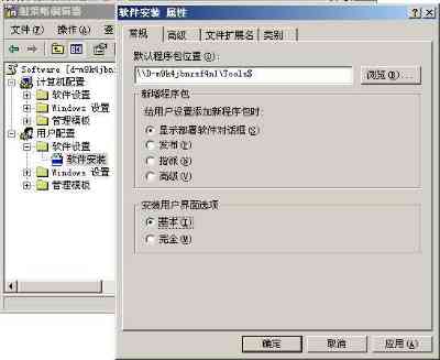 接着选中Software并单击下方的“编辑”按钮,在打开的“组策略编辑器”窗口中依次点击“用户配置→软件设置→软件安装”。接着右键单击“软件安装”,并在弹出的菜单中选择“属性”。在“软件安装 属性”对话框中手工输入“\\计算机名\共享文件名”,然后选中“显示部署软件对话框”和“基本”两项(见图)。