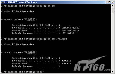 第四步:释放网络参数后再次执行ipconfig我们会看到当前得到的网络参数已经为空,所有信息变成0.0.0.0。(如图1)