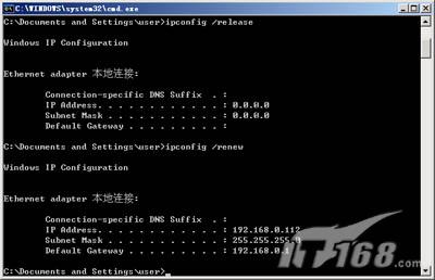 第三步:如果可以获得正确的IP地址说明DHCP正常,如果发现获得错误的地址,其中包括169.254.*.*这样的形式,则执行ipconfig /release命令,该命令是将当前获得的网络参数信息释放。