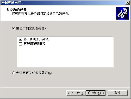 在上面的画面中,暂时不需要让该用户去“管理组策略链接”,所以在这里,仅仅选择“将计算机加入到域”,然后点“下一步”: