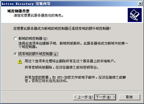 安装第一台时选择的是“新域的域控制器”,这里要选择的是“现有域的额外域控制器”,然后点“下一步”: