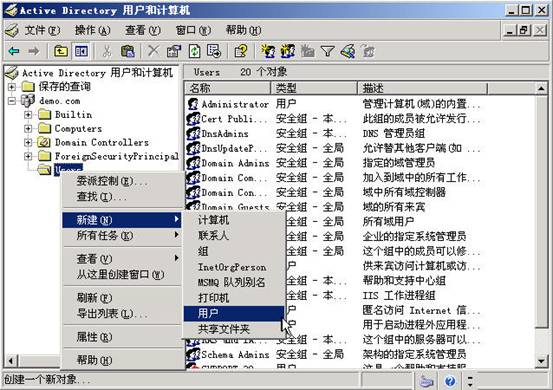 先来新建一个用户,展开“demo.com”,在“Users”上击右键,点“新建”-“用户”: