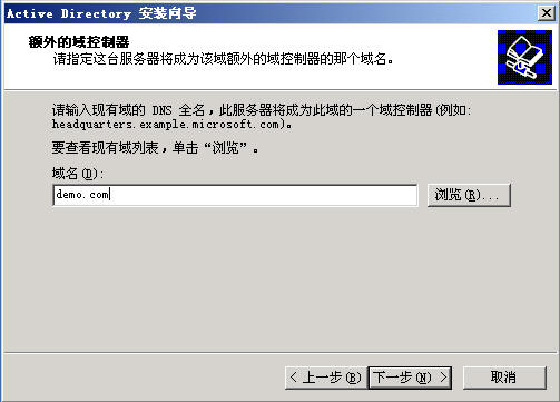 当把下面的客户端加入到域后,如果域控制器处于关闭状态或者死机的话,那么,会发现下面的客户机无法登陆到域,所以再建立一台域控制器,用来防止其中一台出现意外损坏的情况是很有必要的。后来建立的那台域控制器叫额外域控制器。来看看额外域控制器的建立过程吧: