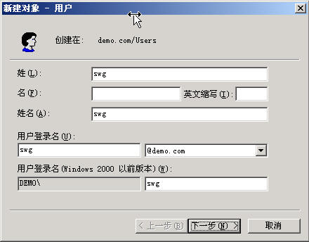 然后出现一个新建用户的向导,在这里,我新建了一个名为“swg”的用户,并且把密码设为“永不过期”。