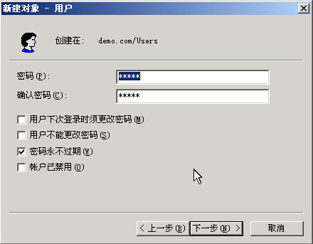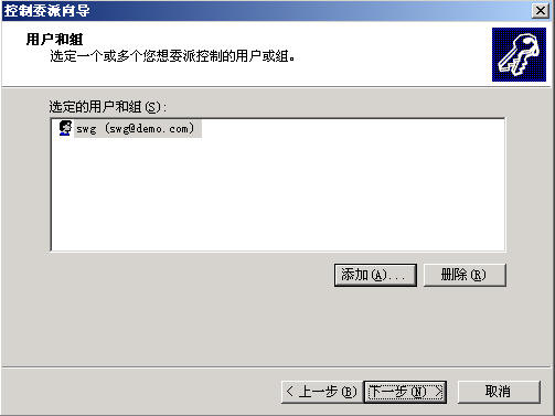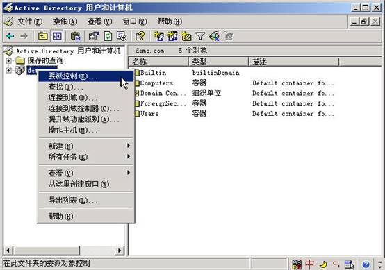 这样点“下一步”,直到完成,就可以完成用户的创建。然后在“demo.com”上点击右键,先择“委派控制”: