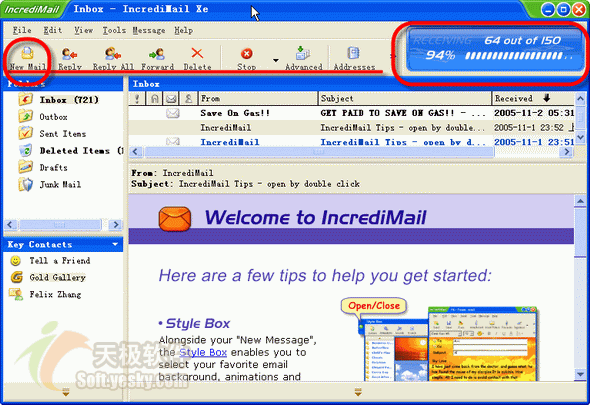 IncrediMail的界面对于已经使用过Outlook和Foxmail等软件的朋友不算陌生,各栏目几乎没什么两样。但是你仔细观察,就会发现IncrediMail在右上角展示了正在收信发信的进度,这个小小的改动我认为很有价值,因为在其他一些软件都是另外弹出窗口,这使您感觉软件在默默为您服务,虽然功效同样,但总体的感觉是贴心了。