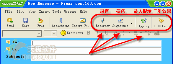定制一枚顶好的签名是展示您个性的最好方式,IncrediMail解决了无法手写添加签名的问题,用简单的方法让这一重要功能简单上手。在主界面选择“New Mail(新信件)”,在弹出的窗口您可以看到下面的写邮件窗口,我们关注的是下面标出的四个功能,依次是“录音”、“签名”、“打字声音”、“三维效果”,我们首先看如何创建签名。
