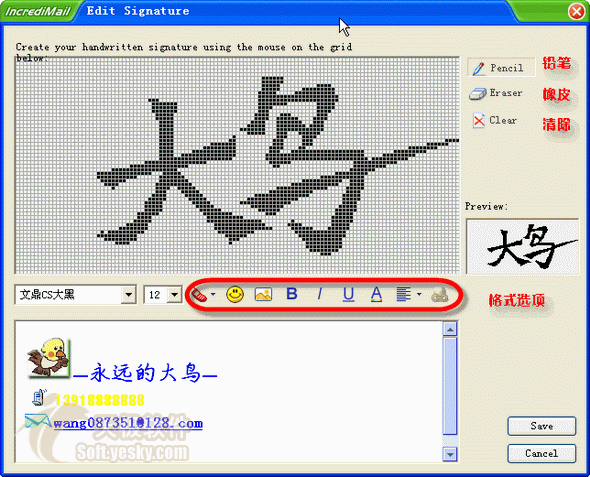 点击“New Signature(新签名)”,出现手写编辑和文字图片编辑两个输入区域,在手写区域您可以使用铅笔工具创建您的手写签名,橡皮用来擦除和修改,下面的窗口可以插入图片,输入一些信息,您看我的签名漂亮吗?