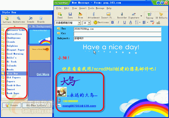 您可以发现,选择“New Mail(新信件)”后,界面左侧会出现信件背景选择,这可是软件一大亮点,近百种各种风格的信件背景供您选择,还可以可以在网上搜寻最新的样式,之后就是写信的内容了,最后选择签名,一封个性十足的信件就基本完成了!