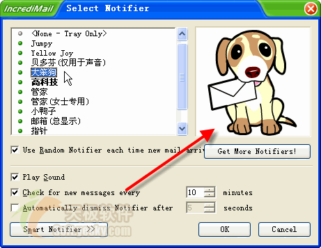 IncrediMail还提供了一个“信件提示”的功能,在主界面的“Notifier”中设置,每到信件收到的时候都会有可爱的动画提示,很是不错!