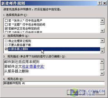 如要删除邮件名中含有“恭喜中奖”词语的邮件,按以下步骤执行即可:单击“工具→邮件规则→邮件”,单击“新建邮件规则”;选择“若‘主题’行中包含特定的词”和“删除”,填入文字“恭喜中奖”。这样,邮件就直接放到“已删除邮件”中,如果不想接收,可在“应用规则”中选择“在服务器上删除”(如图3)。