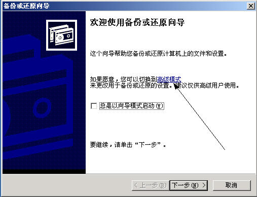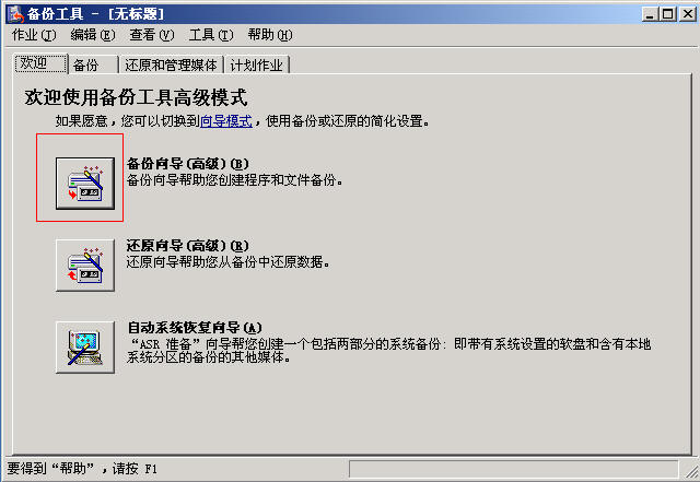 再点击用红框标出的“备份向导(高级)”,这时会出现一个备份向导: