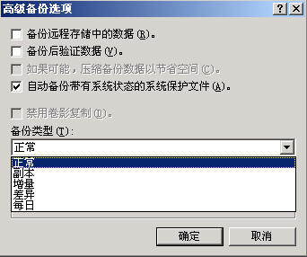 在这里,可选择一些如数据备份完成后验证其完整性之类的选项,这个大家可以根据需要进行选择,主要向大家简单介绍一下五个备份类型: