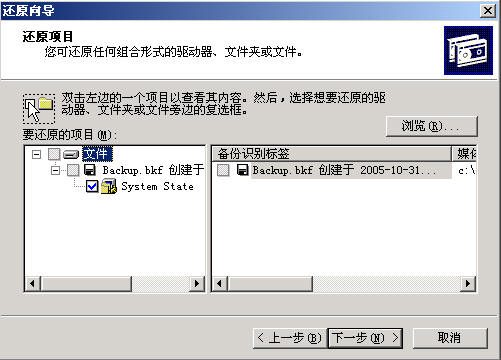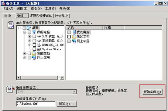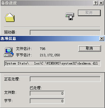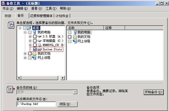 在这里,需要提醒大家的是,如果你只是想备份活动目录的话,那么你只需要备份一下系统状态就可以了。但本人强烈建议:最好再做一个整个C盘的备份!以防止丢失一些其它的数据。在这里,我为了节省时间,就仅仅备份一下系统数据了: