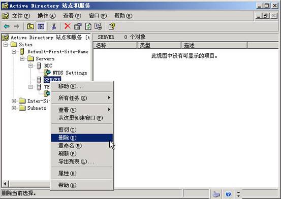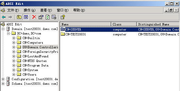(2)、使用ADSI EDIT工具删除Active Directory users and computers中的Domain controllers中欲删除服务器对象,